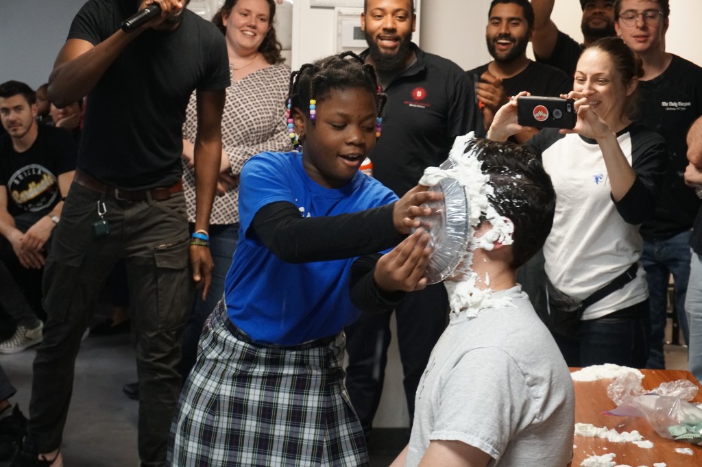 In addition to the raffling off of Thanksgiving meals, the annual “pieing” event occurs at the Roosting Rally that concludes the week. Those students in each class who donated the greatest number of nonperishable items earn the privilege of “pieing” their teacher. The student who donates the greatest number of non-perishable cans across his or her campus gets “to pie” a member of the Admin team. As you can imagine, our scholars LOVE the event. As for the staff members who get pied, we won’t speak on behalf of them… But the event is incredibly joy-filled—families, scholars, and teachers alike cheer and laugh through the whole thing. The Roosting Rally is concluded by an unveiling of the total number of food items raised. This year, across our three campuses, we donated a total of 43,014 non-perishable goods to three local food pantries.