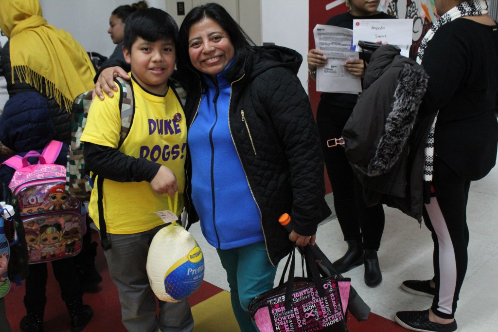Every year, during the week before Thanksgiving break, each campus organizes a school-wide food drive. The annual tradition brings together families, students, staff, and the wider Mott Haven community in order to give our students the opportunity to practice generosity and gratitude—virtues they hear about so often at school. Families can contribute to the food drive in three ways: scholars can bring in non-perishable goods, families can donate funds for the local food pantry to purchase items, and/or scholars and their families can transport the non-perishable goods from the school to a local food pantry at the end of the week. Those scholars who walk the items to the local food pantry are entered into a raffle. On the last day of the week at the Roosting Rally, a weekly campus-wide gathering, names are drawn. The winners of the raffle win a turkey and voucher to buy Thanksgiving meal items. This year, thanks to the generosity of our board of directors who donated funds for the food vouchers, 60 of our scholars took home turkeys and vouchers for a Thanksgiving meal to share with their families.